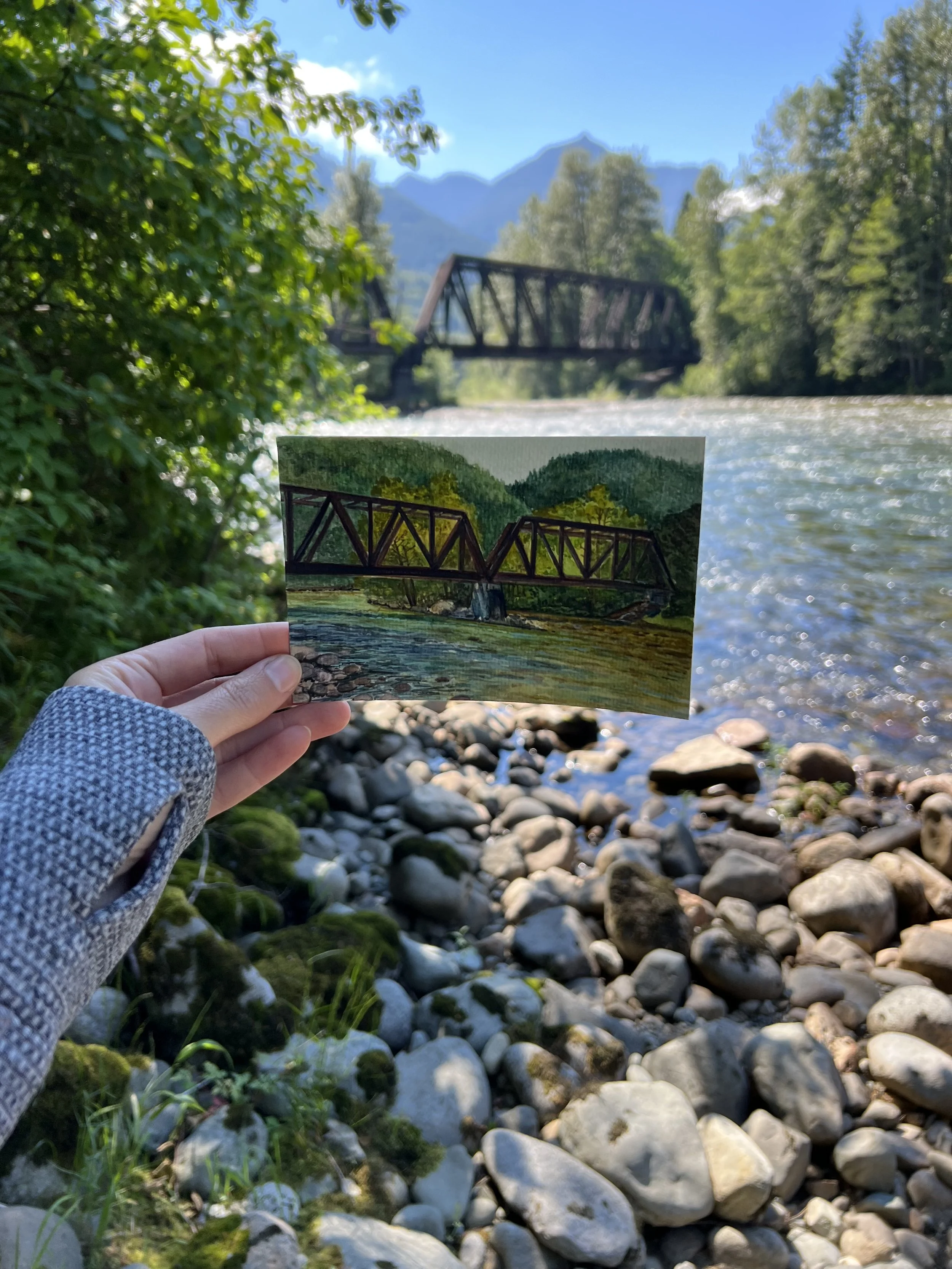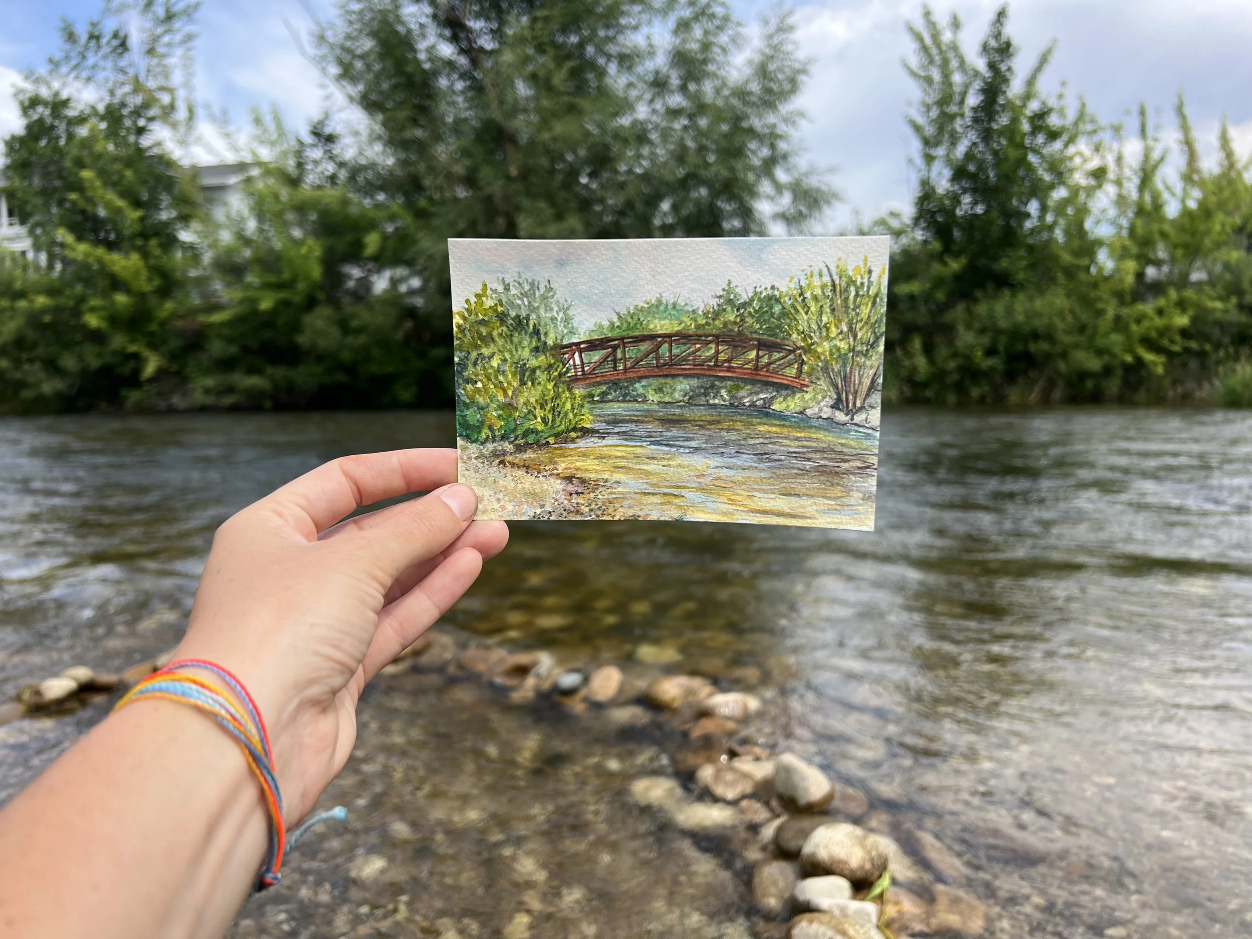 When possible with my plein air watercolor paintings, I love to use water from the source featured in the painting… this one was no different! I love the added layer that is created by having the actual water of the river bring the scene to life.