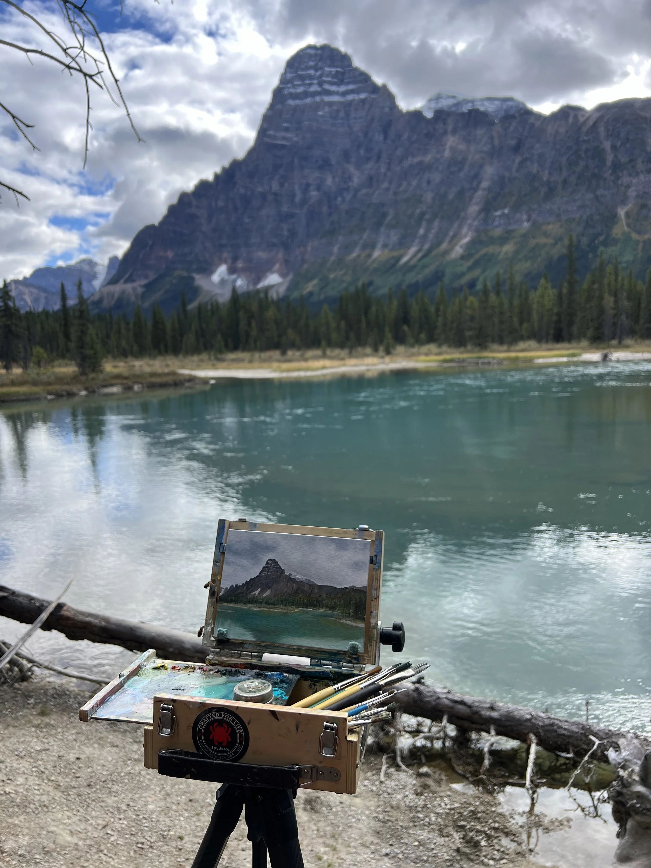 Nothing quite compares to the combination of the towering peaks of the Canadian Rockies and the spectacular turquoise glacial fed waters of the surrounding rivers and lakes. To say I could spend a lifetime painting this part of the world would be an understatement. What a perfect day of sunshine and mountains.