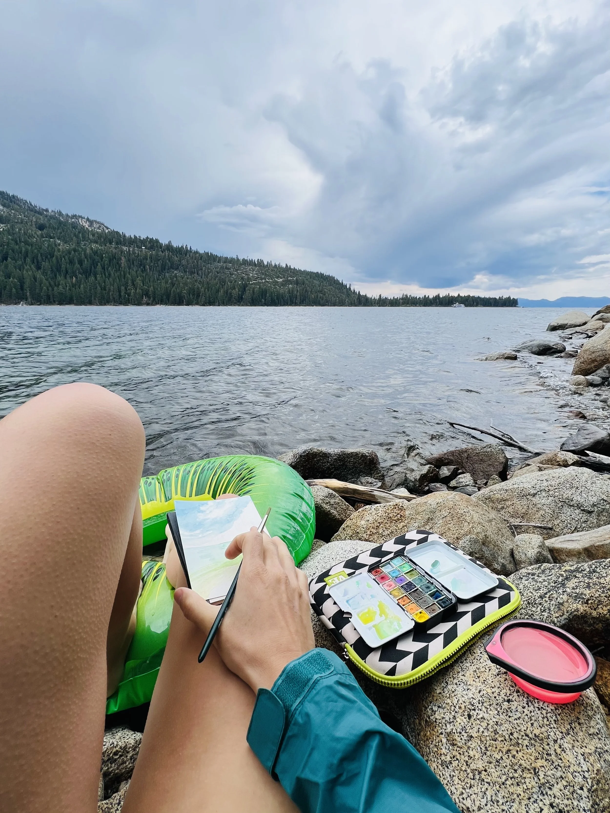It was a race against the storm clouds for this one. An afternoon that started with sunshine and sparkling waters, ended with stormy skies and wild winds. After floating in the brisk waters of Lake Tahoe for part of the afternoon I retreated to the shoreline to paint. In a matter of minutes, the vibrant colors of the water faded under gray skies and I was left to my imagination to bring the painting to life.