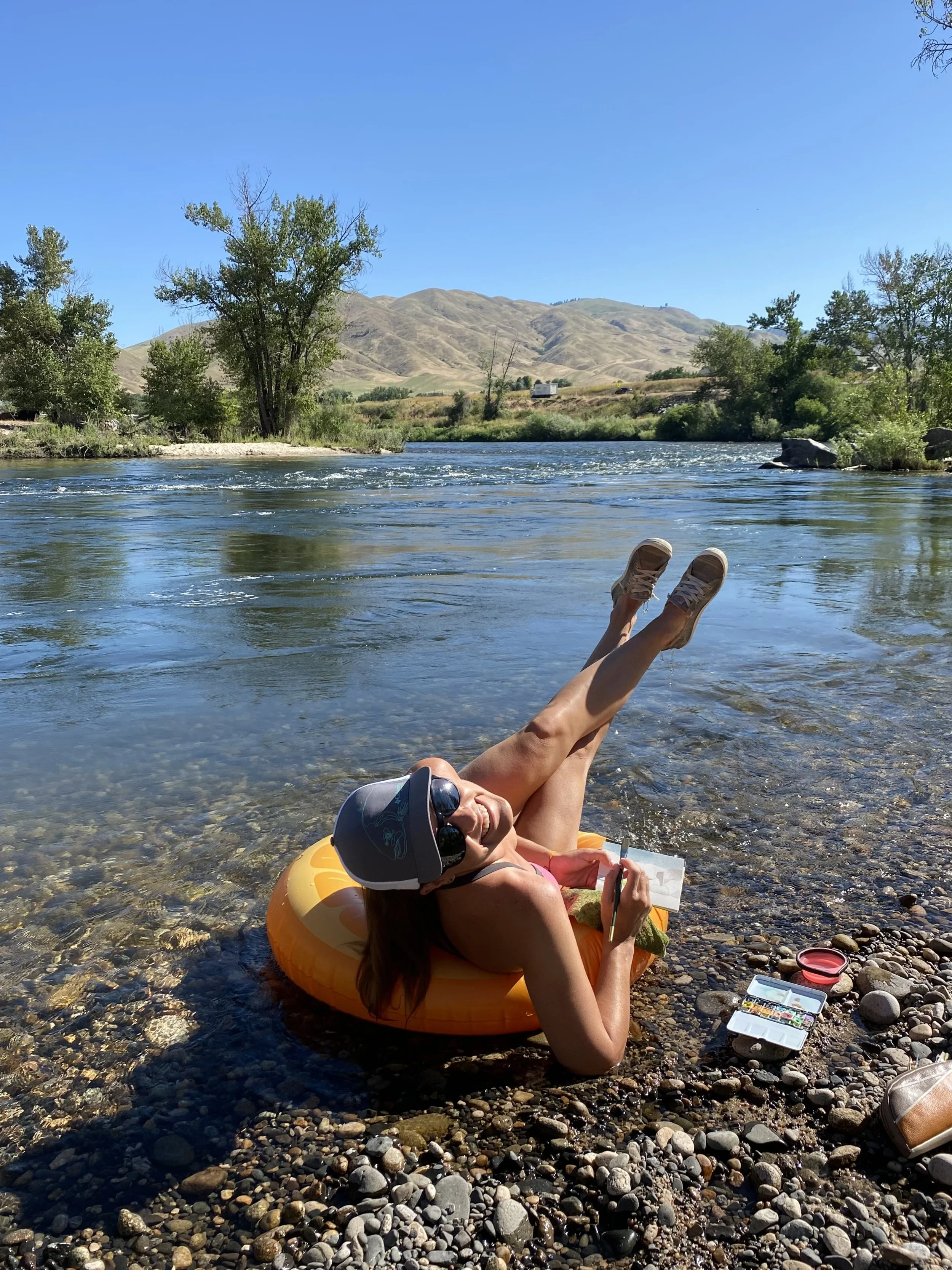 Some days it’s both about relaxing and painting. With the warm summer temps, a river day was necessary. I packed up my car and with my mom as my co-pilot, we head up the road to one of my favorite spots I’ve found so far in my Idaho exploration. With a small gravel island, it’s a beautiful and isolated spot to enjoy the sunshine. It was a day of painting, floating, a picnic and an unexpected adventure.