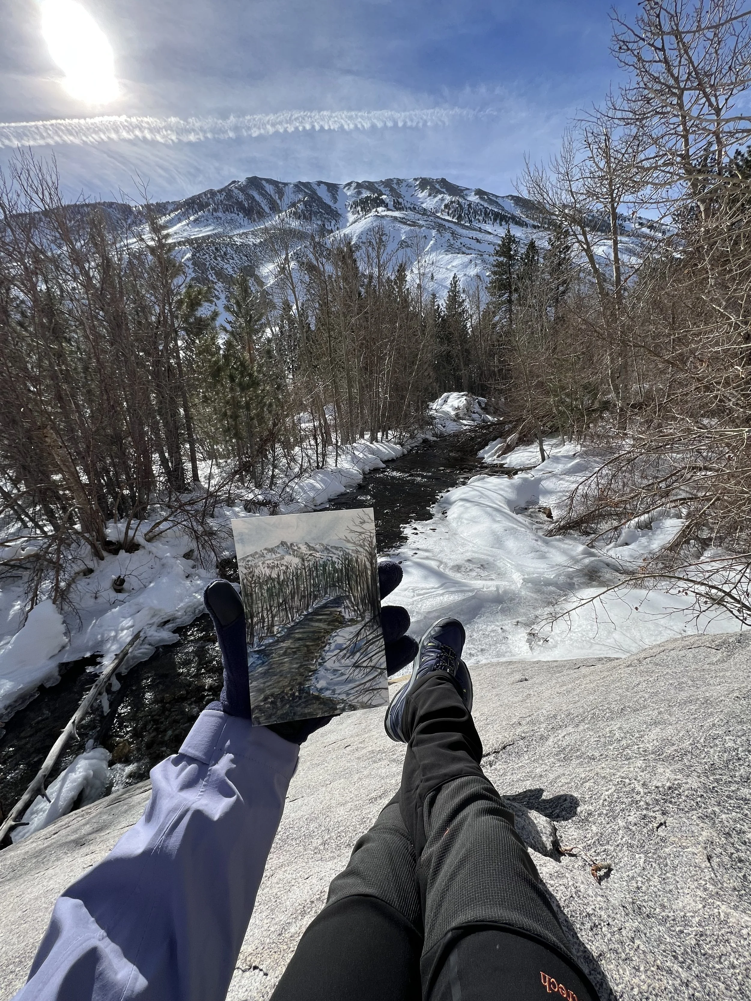 A quiet morning amongst the trees with nothing but the soothing tones of the babbling creek filling the air. Some days it’s less about how far and how fast you hike, and more about just breathing in the peaceful perfection that surrounds you. After meandering about for a few hours, I happened upon a rock with a view worth painting. There is a certain calm to winter in the mountains; everything feels so still but once you slow down and listen, it’s as if the snow is alive. Painting in this spot for hours, I was fortunate enough to hear it all. Always such a treat to be amongst such majesty.