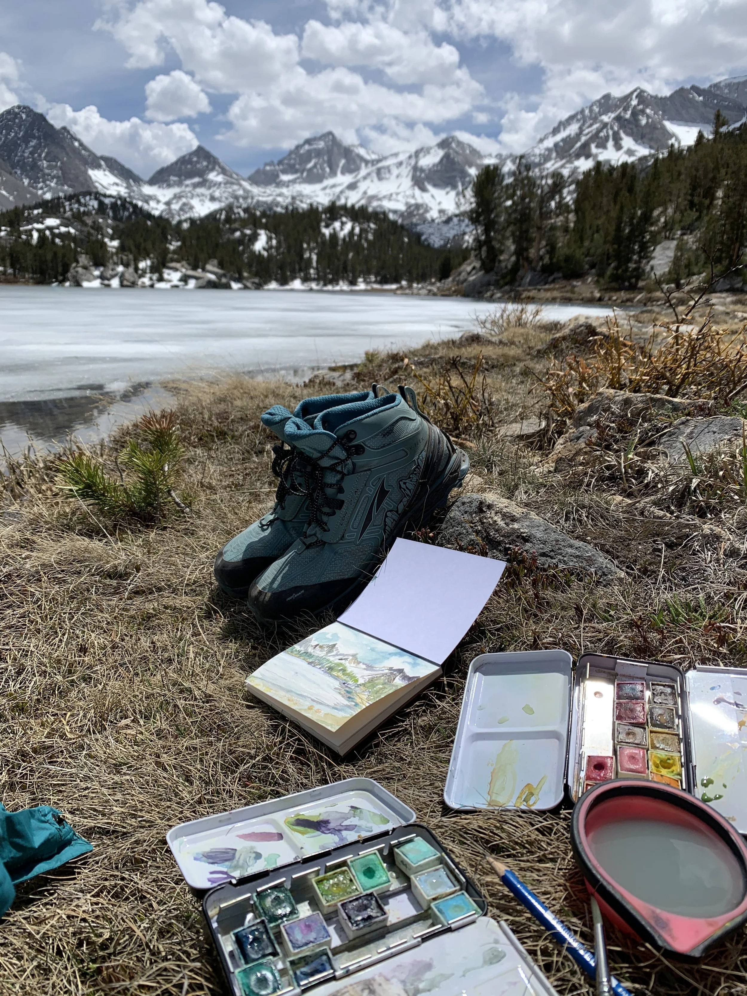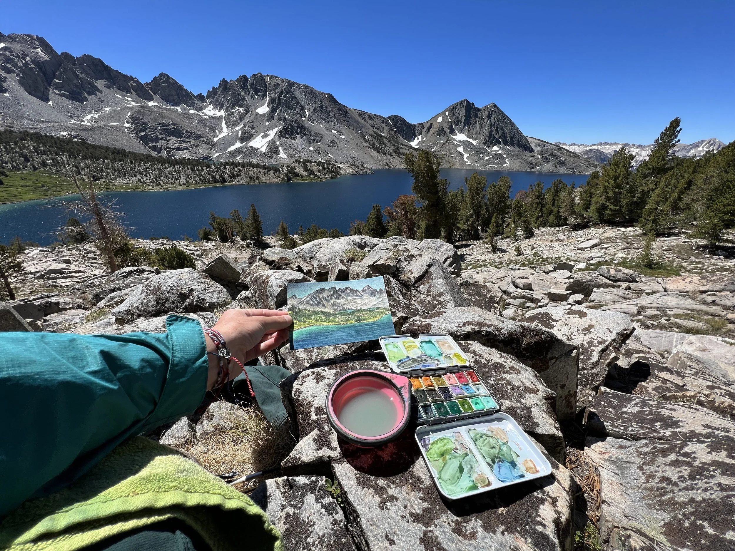 From a frozen lake just over 12,000' at Mono Pass, to the untouched beauty of Ruby lake, my hike at Rock Creek was one for the books. With endless lakes lining the valley, the entire area is alpine magic at it's finest. After a 1am wake up, a 5 hour drive, and a stunning 10 mile hike with plenty of elevation gain, I could not have found a more perfect spot to stop and paint in the valley. The quick painting created on this trip added such a beautiful memory to the adventure itself. With so much more inspiration lingering, there will certainly be more paintings to come. The overwhelming beauty of the Sierra Nevada Mountains is undeniable.